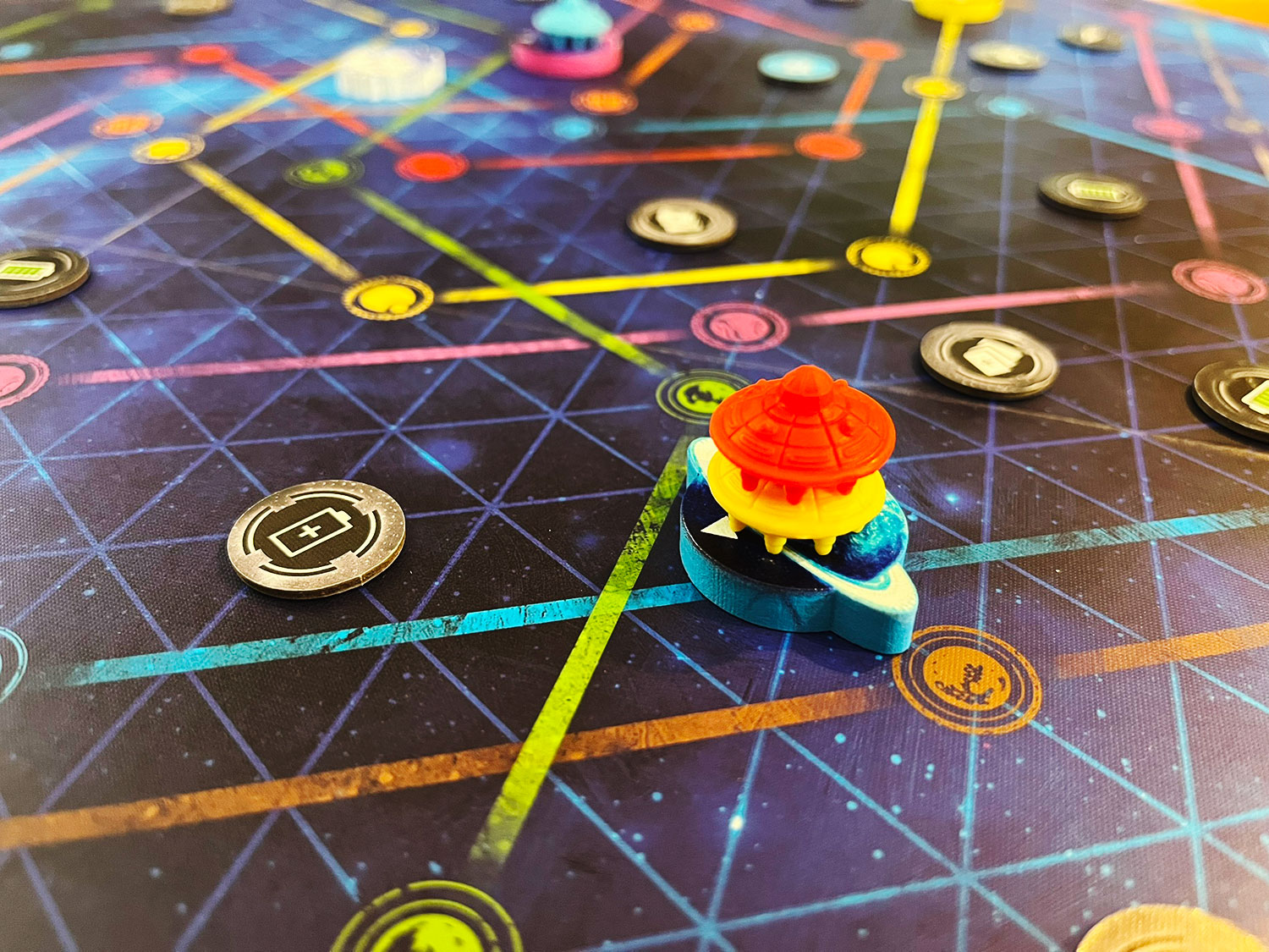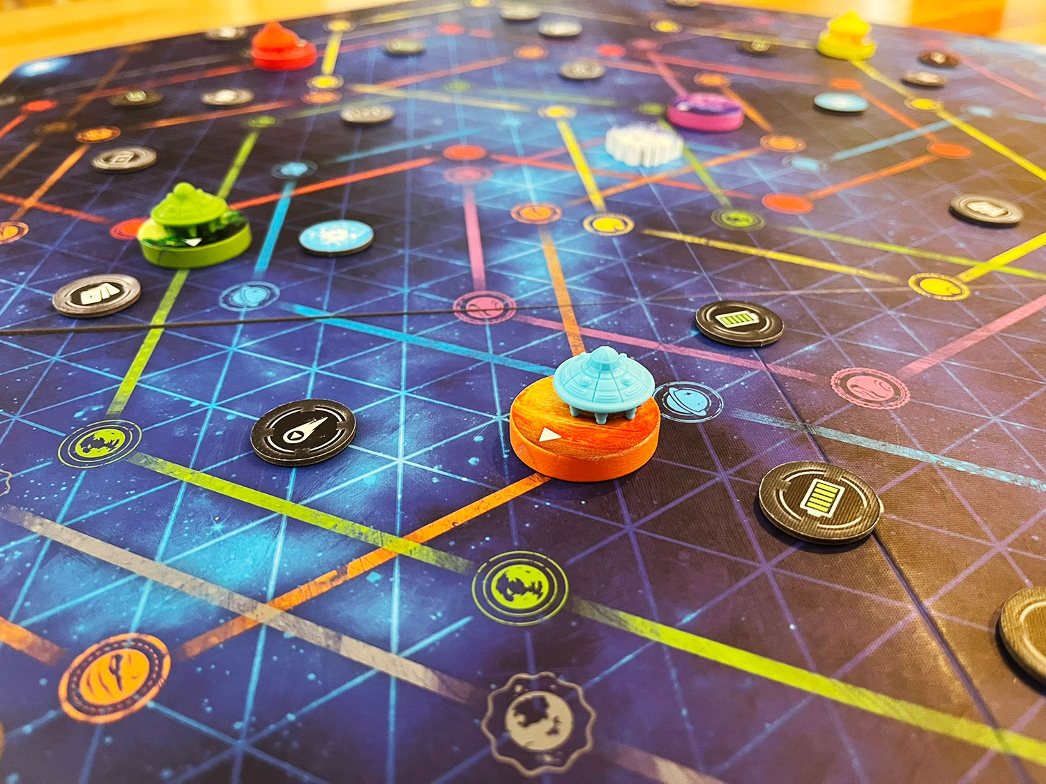 기묘하게 교차하는 "궤도"들. 행성에 착륙한 우주선은 행성을 따라 빠르게 이동할 수 있습니다. 플레이어는 또한 우주선을 우주 격자 위에서 일정 거리만큼 자체 추진할 수 있으며, 보유한 에너지로 이동 거리를 늘릴 수 있습니다. 카드에 따라 에너지 보유량을 회복할 수도 있습니다.