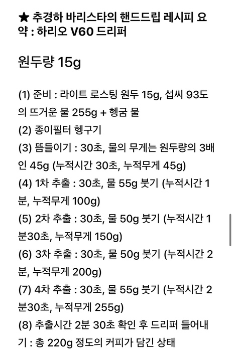 물이 좀 많다고 볼수도있는데, 일반적으로 15g ~20g 사용해서 내리고, 유툽에 핸드드립 레시피 보시면 많습니다. 조금씩 조금씩 따라서 해보세요.