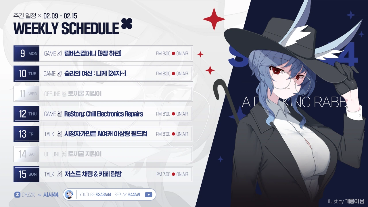 베스트🗓️ 사사님 방송 일정 안내 (02.09~02.15)[]수히나· 추천 6· 조회 229· 날짜 02.09