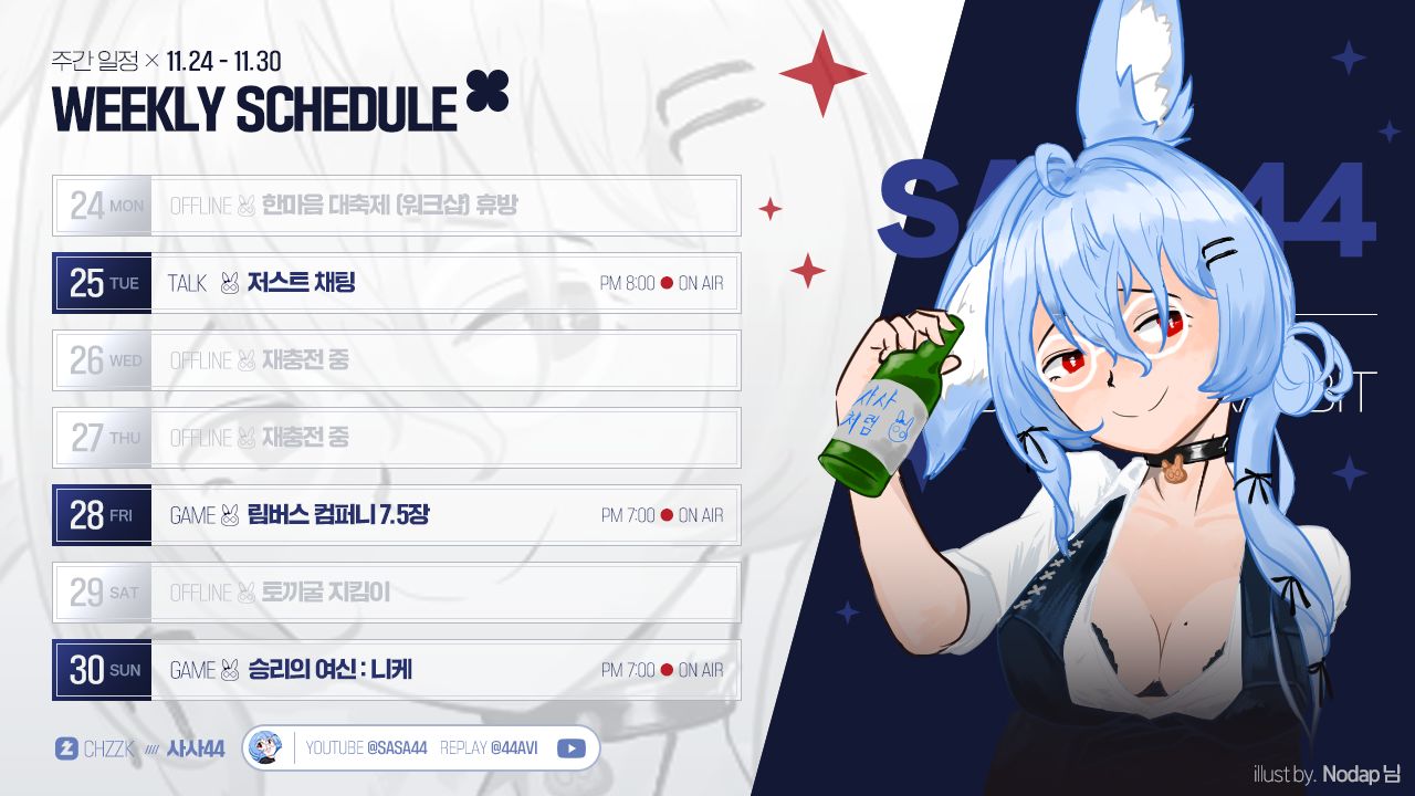 공지🗓️ 사사님 방송 일정 안내 (11.24~11.30)[]수히나· 추천 3· 조회 199· 날짜 11.25