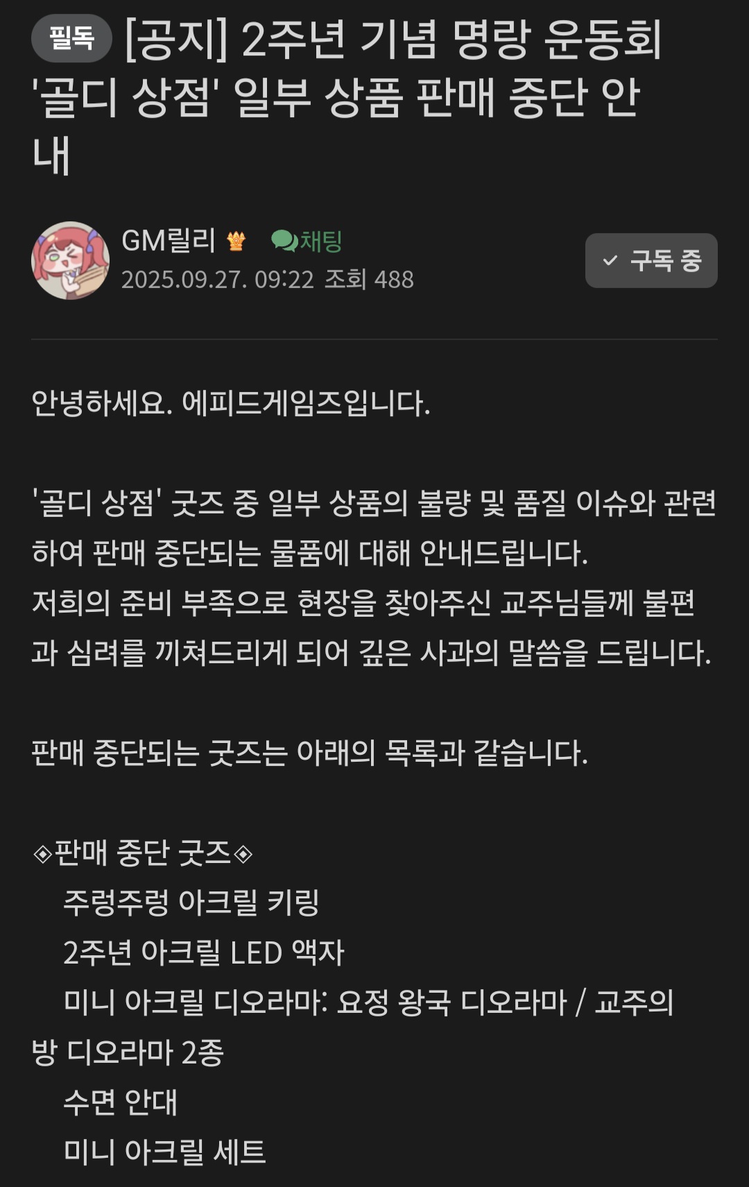 끝으로 이와 같은 사태가 다시 발생하지 않도록 해당 업체와의 협업을 전면 중단하도록 하겠으며, 교주님들께서 시간 내어 찾아주신 행사를 즐거운 마음으로 찾아 주실 수 있도록 더욱 더 노력하겠습니다.